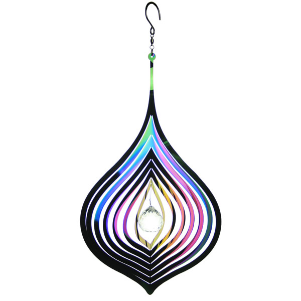 Prachtige windspinner Druppel met schitterend verloop van regenboog kleuren, gemaakt van hoogwaardig roestvrij staal (RVS). Geschikt voor buiten en binnen. Draait in de wind en door het optische effect van de wind op de RVS gekleurde lamellen is het een opvallende tuindecoratie. De windspinner kan vrij opgehangen worden onder een afdak, aan een pergola of in een boom. De windspinner is voorzien van een haak met nylondraad waaraan deze eenvoudig opgehangen kan worden. Windspinners worden door de wind in beweging gebracht en zijn een mooie aankleding voor je terras of andere buitenruimte.