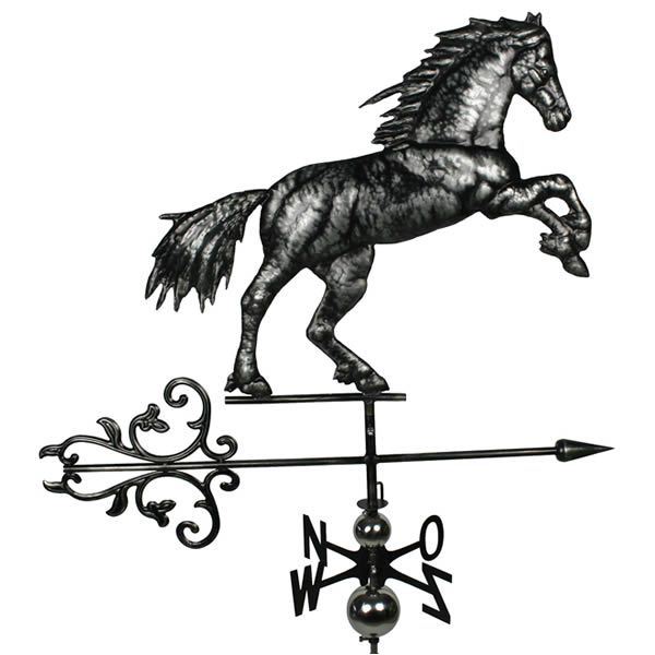 Deze schitterende handgemaakte windwijzer Steigerend Paard van RVS wordt geleverd inclusief windroos, staaf en bollen.