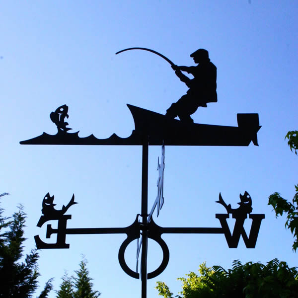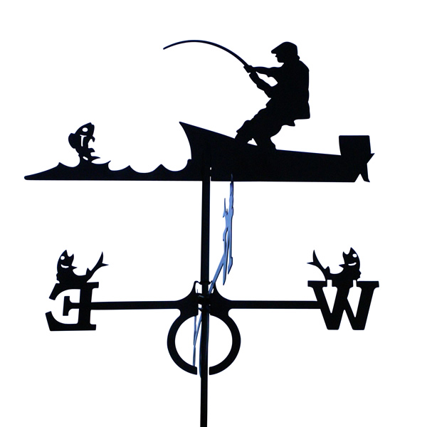 Deze windwijzer Visser in bootje Deco-design L is gemaakt van plaatstaal en voorzien van een zwarte poedercoating voor bescherming tegen weersinvloeden.