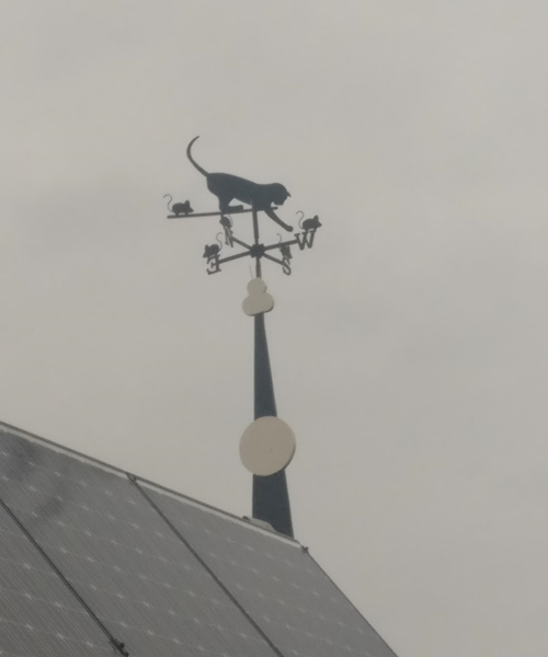 De windwijzer Kat en Muis Deco-design M is erg populair onder onze klanten: onlangs aangekocht door onze klant Nathalie Idsinga uit Lies. De windwijzer staat gemonteerd op een houten dak nok bovenop het huis.
